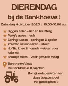 Vier Dierendag dit jaar op een plek waar het écht om dieren draait! Op zaterdag 4 oktober opent BankhoeveVlees de staldeuren voor een gezellige, leerzame en smakelijke dag op het erf. Of je nu komt knuffelen met biggen, springen op het springkussen of gewoon lekker wilt genieten van een kop koffie tussen de dieren – er is voor ieder wat wils!